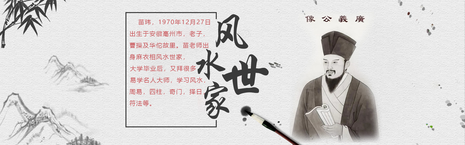苗瑋,1970年12月27日,出生于安徽亳州市,老子,曹操及華佗故里。苗老師出身麻衣相風(fēng)水世家,受家庭影響,對(duì)風(fēng)水學(xué)有很大興趣,從小受爺爺父親熏陶學(xué)習(xí)風(fēng)水,大專(zhuān)畢業(yè)后,又拜很多易學(xué)名人大師。學(xué)習(xí)風(fēng)水,周易,四柱,奇門(mén),擇日,符法等